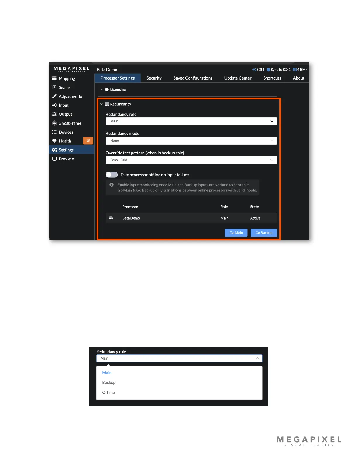 ensure the Advanced mode is ON (Settings → Processor Settings → Advanced). The redundancy controls are located