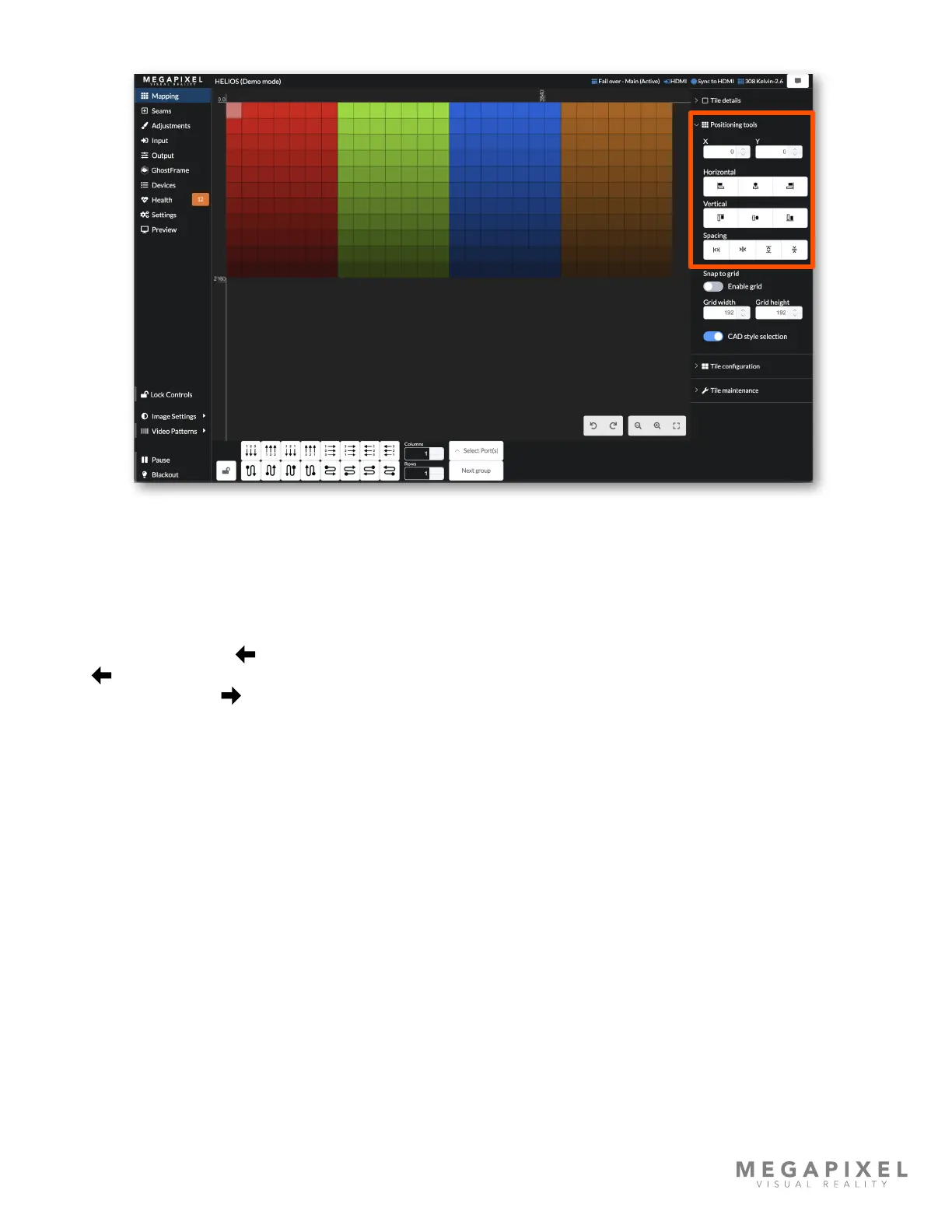 The mapping tools section contains alignment and spacing tools to aid in manual positioning tiles on the map. A grid with