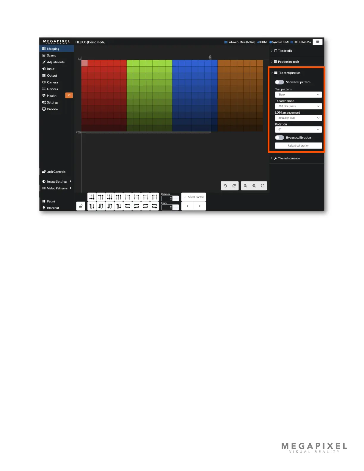 Test pattern toggle - Select the tile test pattern desired and then choose to enable it with the toggle. These patterns are