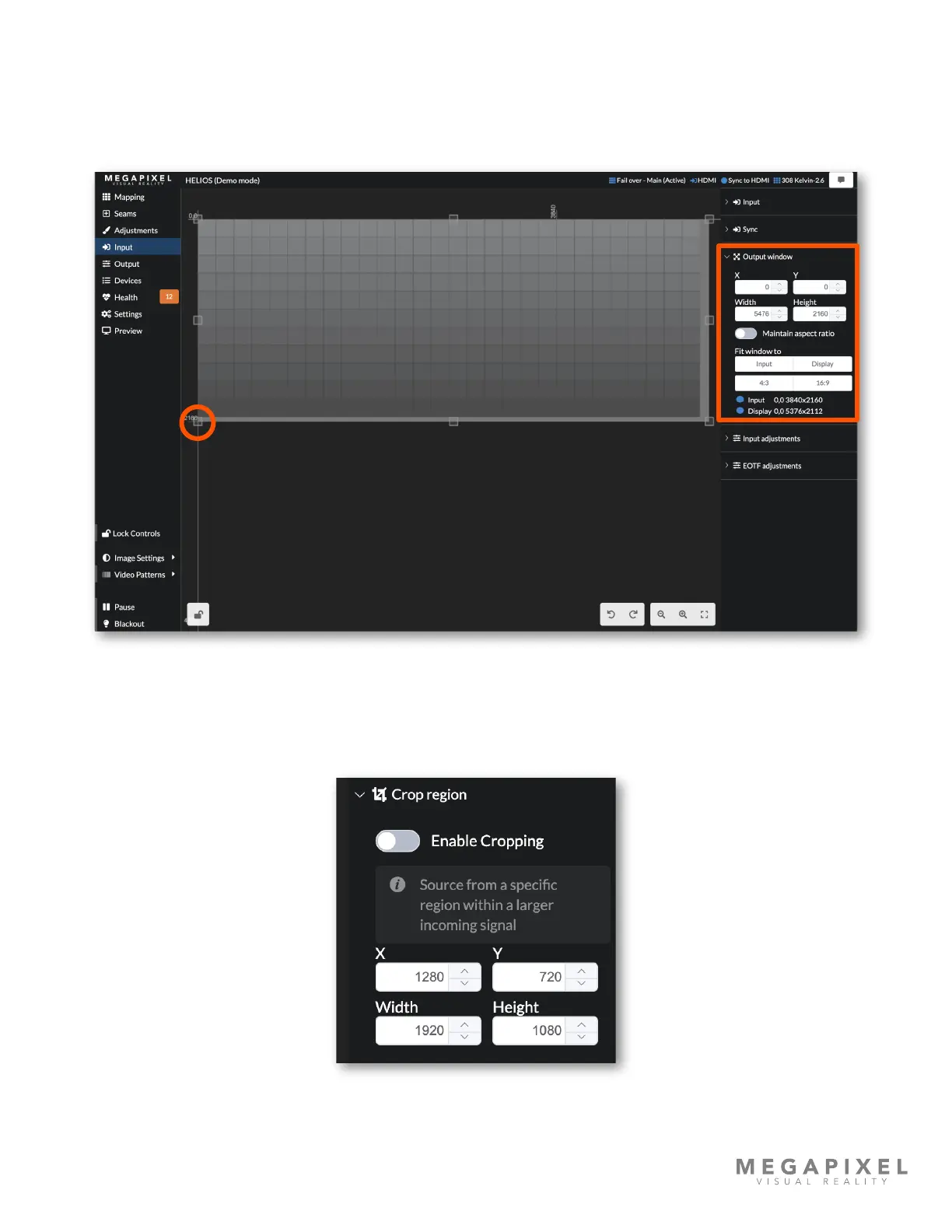 To display only a portion of an input signal, use the crop function by enabling Advanced Mode under Settings →