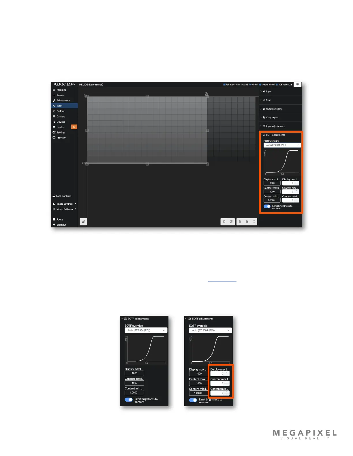 The HELIOS EOTF (Electro Optical Transfer Function) adjustments are used to inspect and manually override EOTF