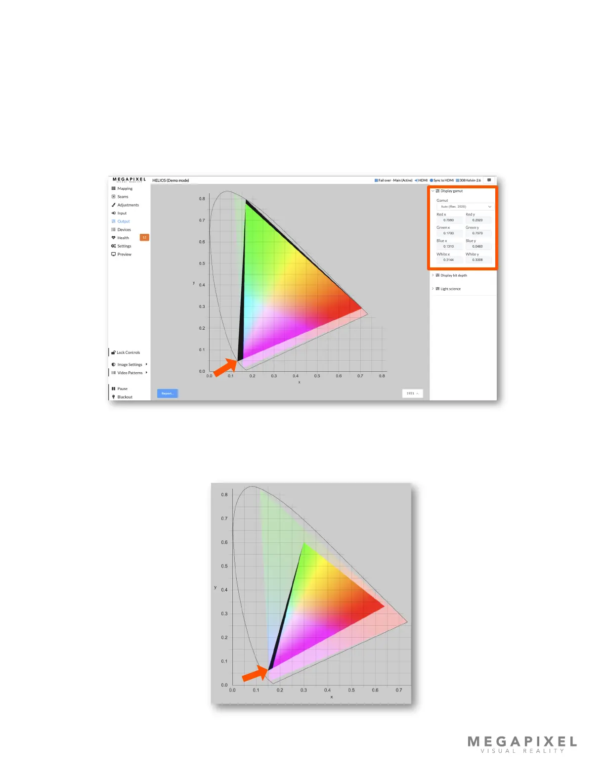 orange arrow below) indicates colors targeted by the settings that are beyond the capability of the display. If the color