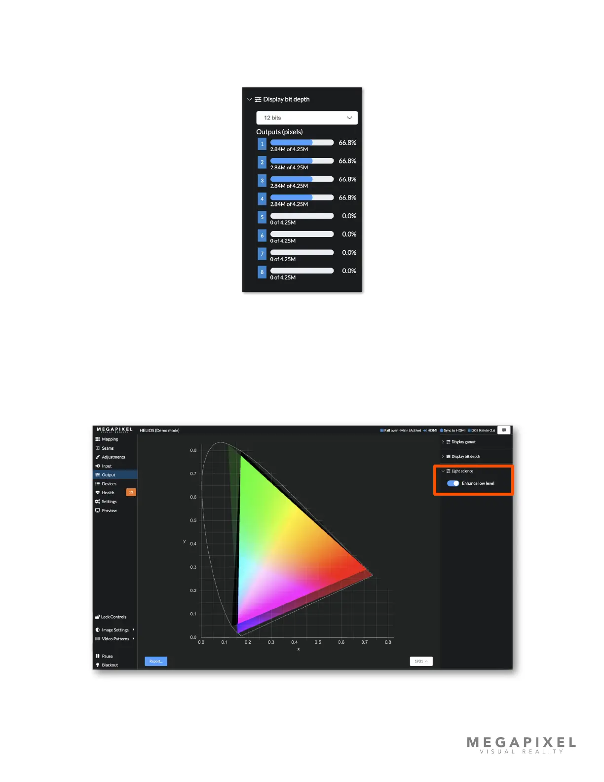 expanding the bit depth in the video signal. HELIOS normally uses 10 or 12 bits per color, but with Light science enabled,