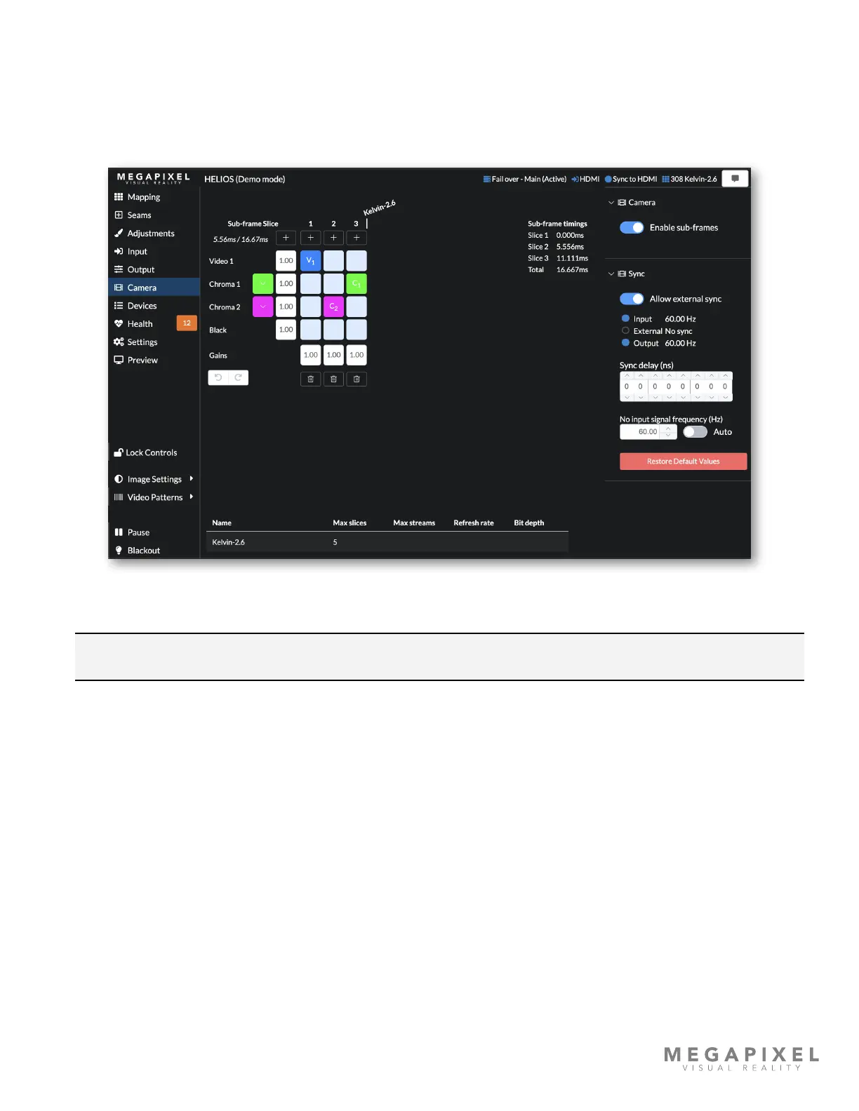 Camera. The Camera pane is used for aligning camera shutters to colored slices. One video slice and colored slices are