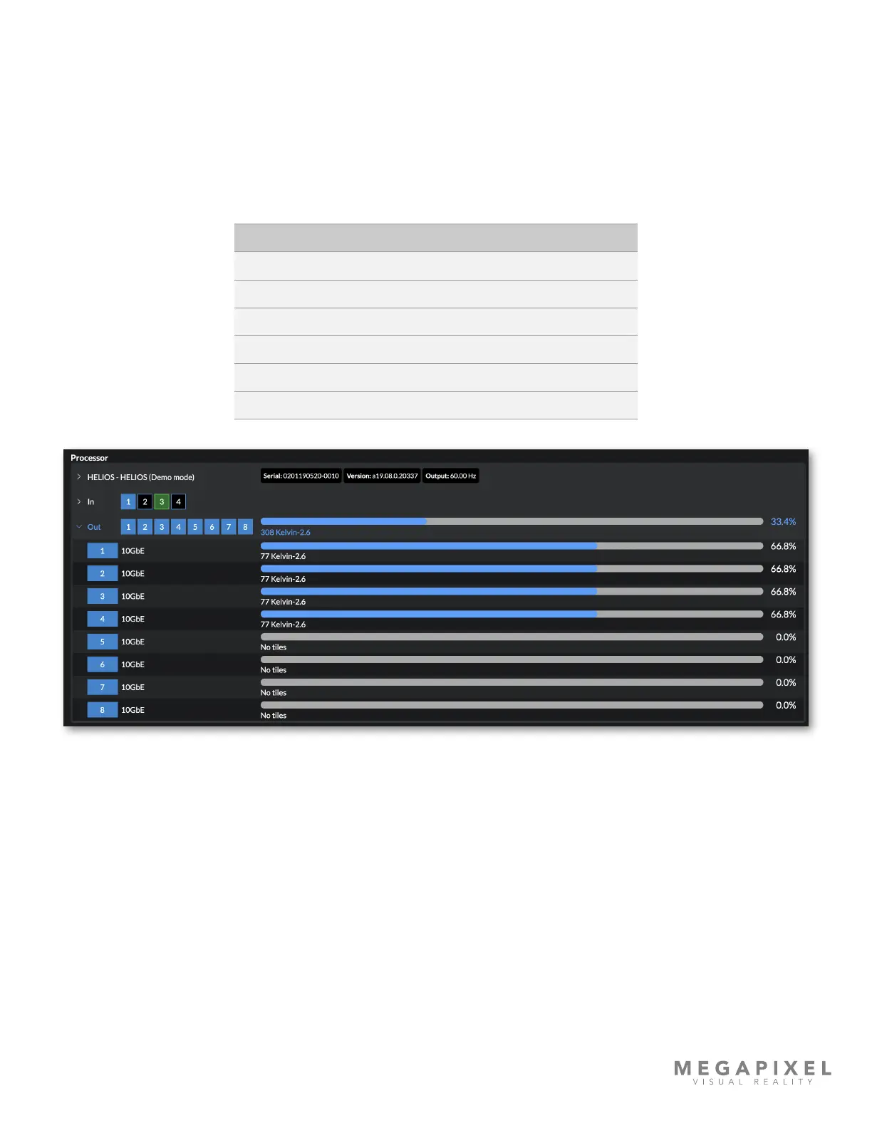 The Out section shows the status of the outputs and a percentage of utilization of the entire HELIOS Processor. Expand the