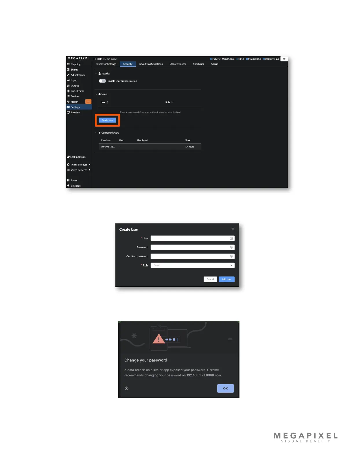In the Security tab, HELIOS can be congured to require a user and password for access. Press the Create User button to