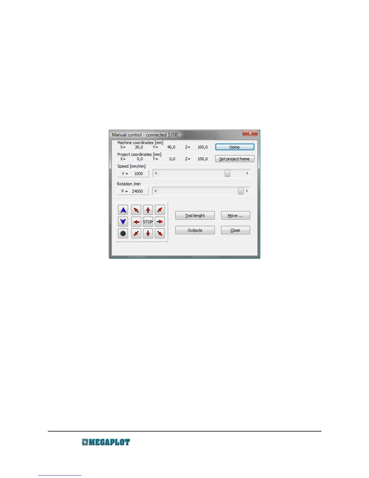 The control window shows the machine co-ordinates (in relation to its absolute home position)