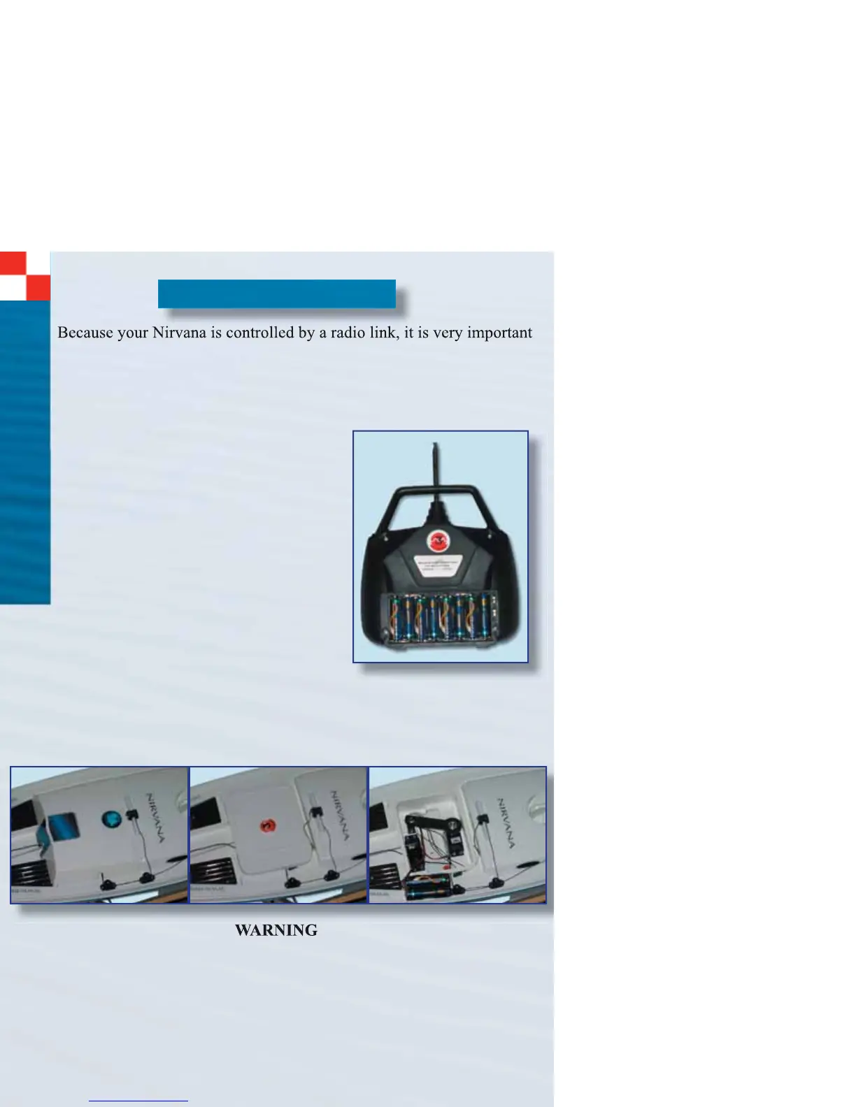 Failure to do so may result in damage to the Nirvana’s servos. Always turn on
