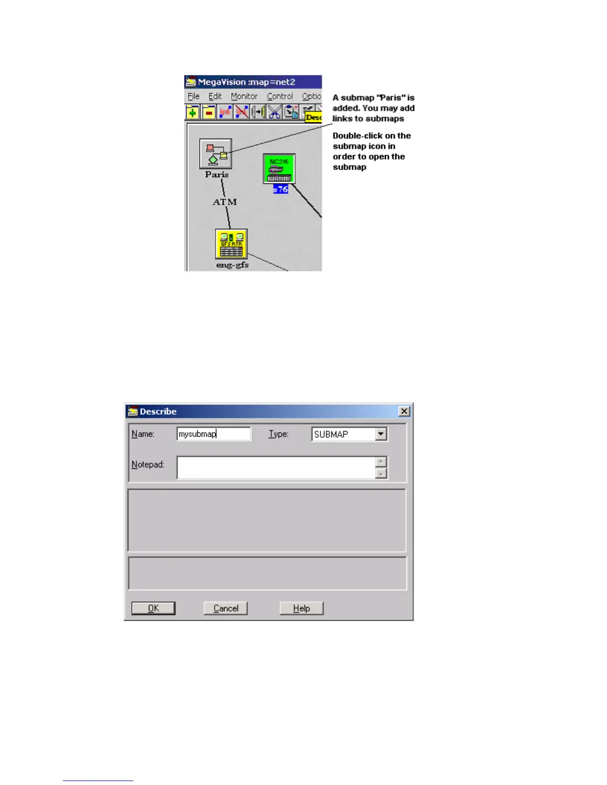 Describe Submap Window opens. Enter a submap name in the Name field and click