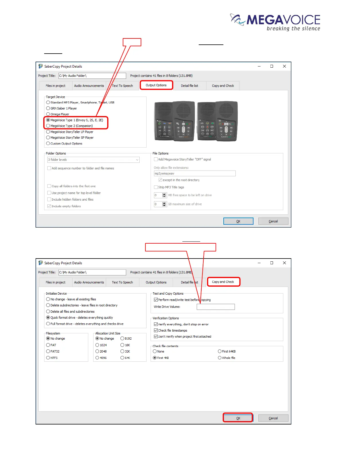 6. Click on the “Output Options” tab. Select MegaVoice Type 1 for Envoy 2 E. Make sure the remaining fields are