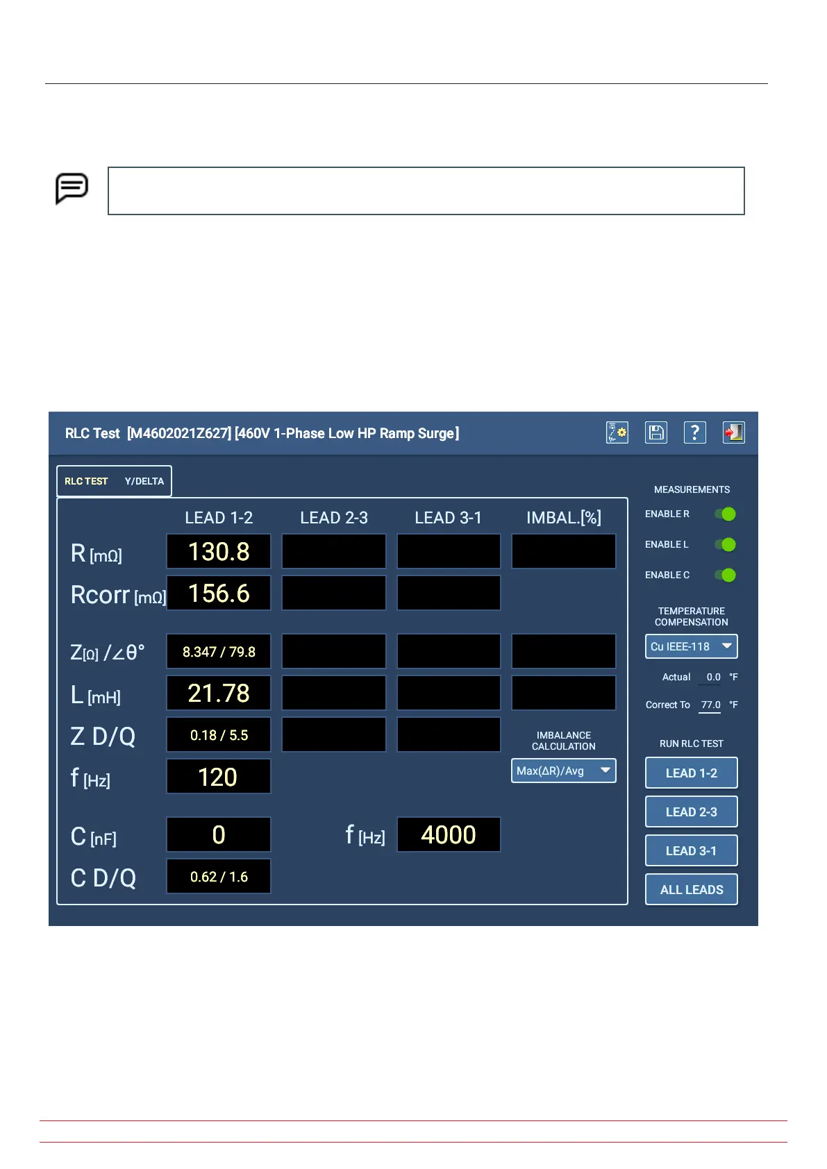 5. Results will appear in the RLC Test screen similar to the example shown below.