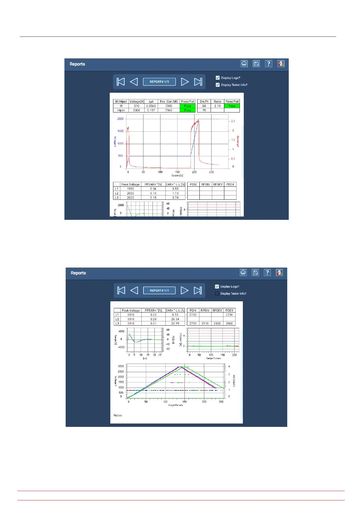 The last example shows the complete Surge Test section that includes results for PD testing displayed in a table an