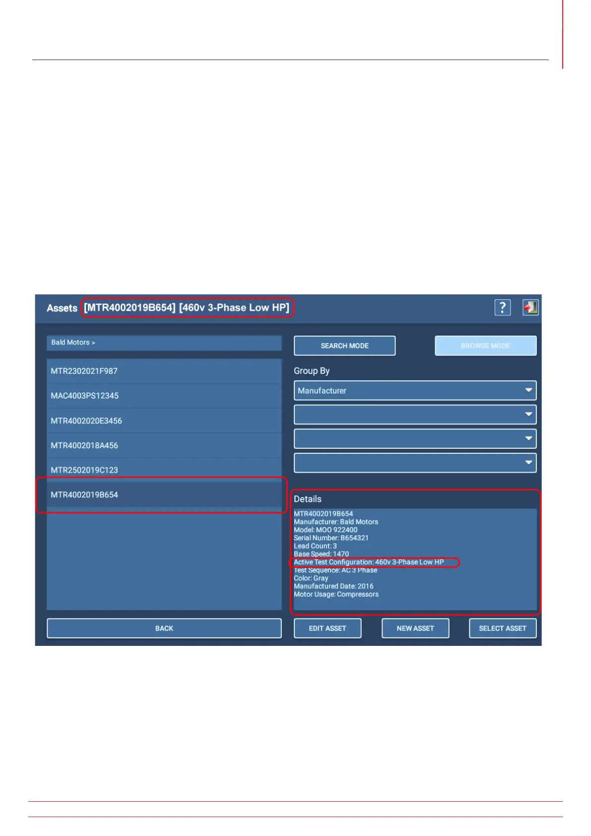 4. Press the SELECT ASSET button to select the asset for testing.
