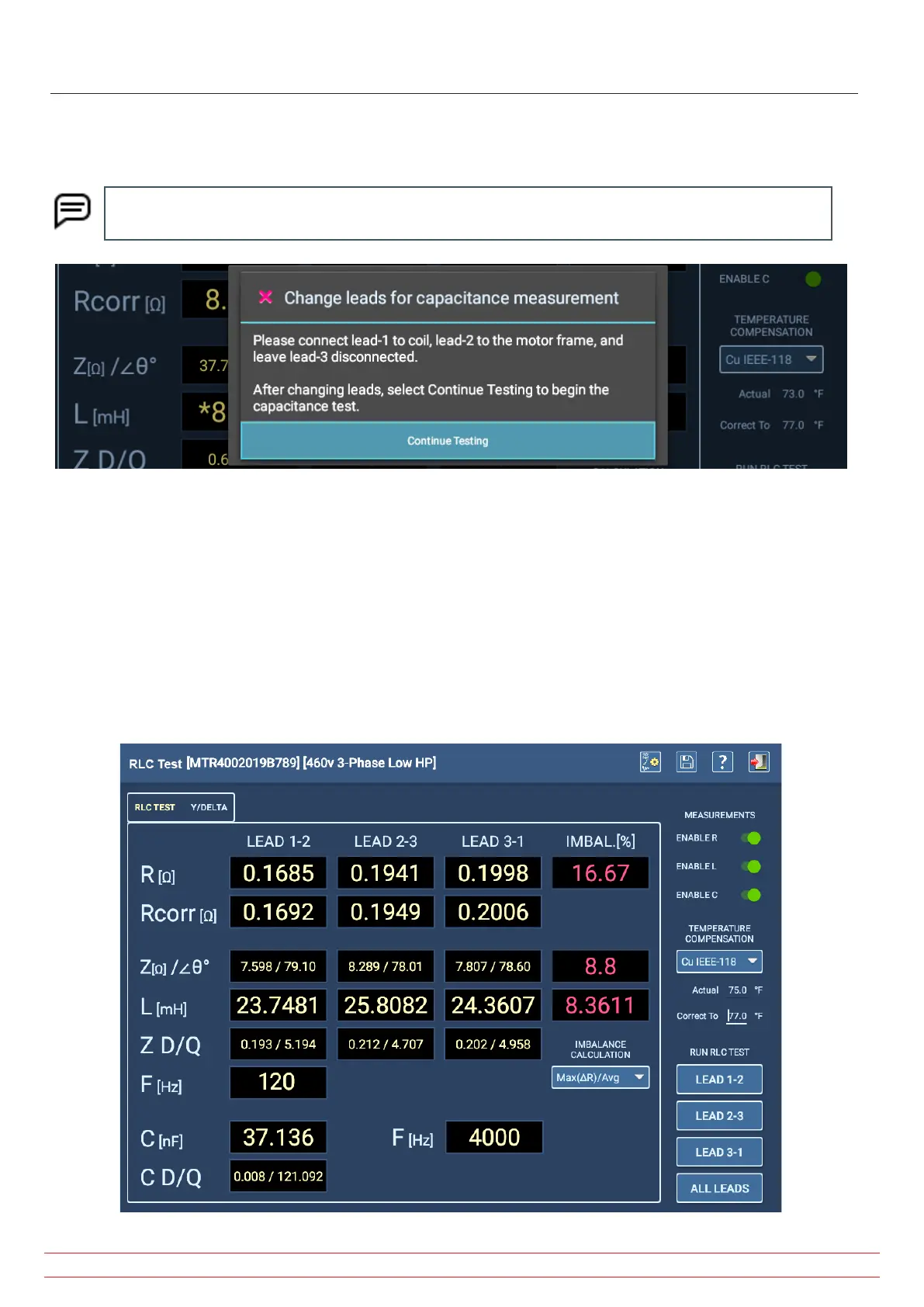 imbalance between the phases and displays results in the main RLC Test tab.
