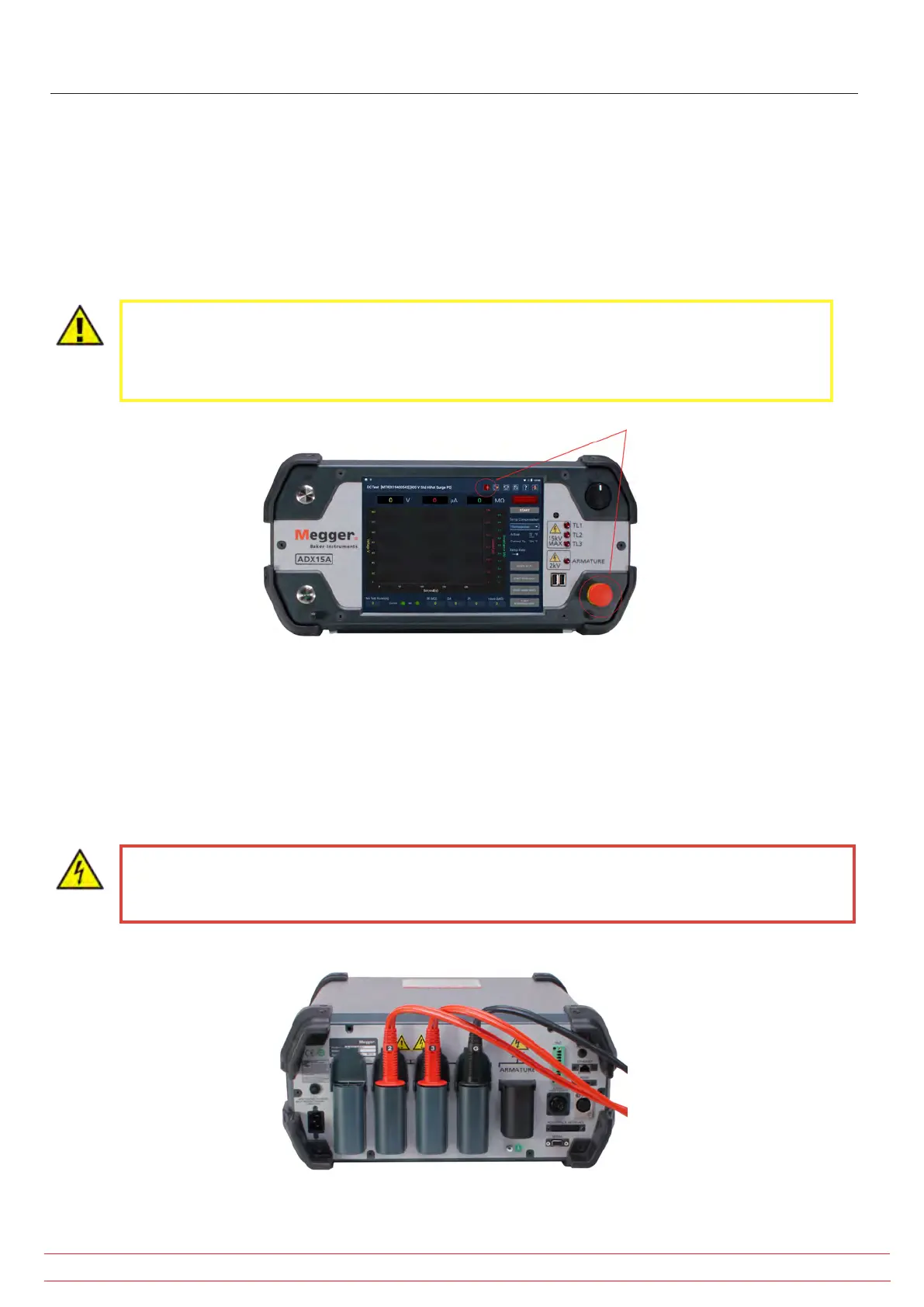 The Megger Baker ADX tester is equipped with a red Equipment Stop (E-Stop) button on the front panel of the unit.