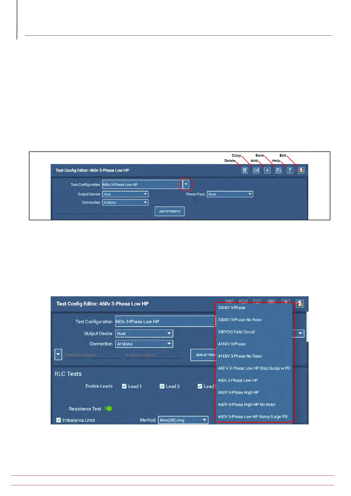 The Test Configuration Editor contains three other sections for specifying RLC, DC tests, and Surge test parameters.