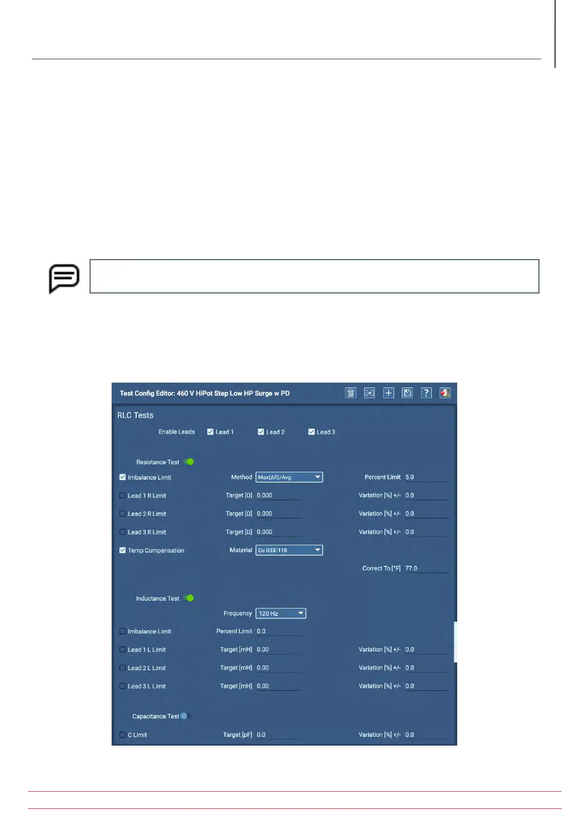 In the RLC Tests section, tests are turned on or off, leads are defined as active or inactive, and target values can be