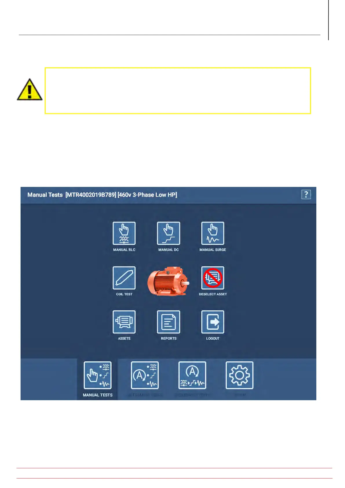 Touching the MANUAL TESTS icon reveals a screen containing icons that provide access to manual RLC, DC, Surge, and