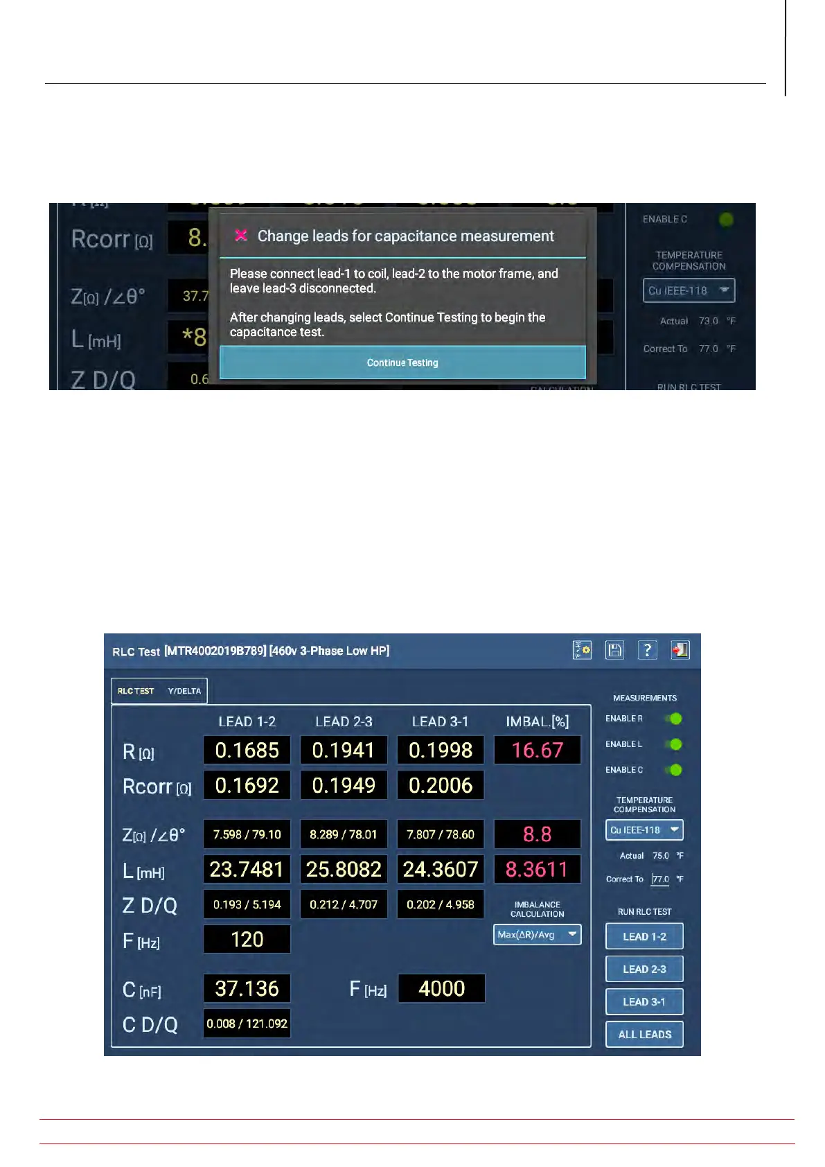 for imbalance between the phases and displays results in the RLC TEST tab.