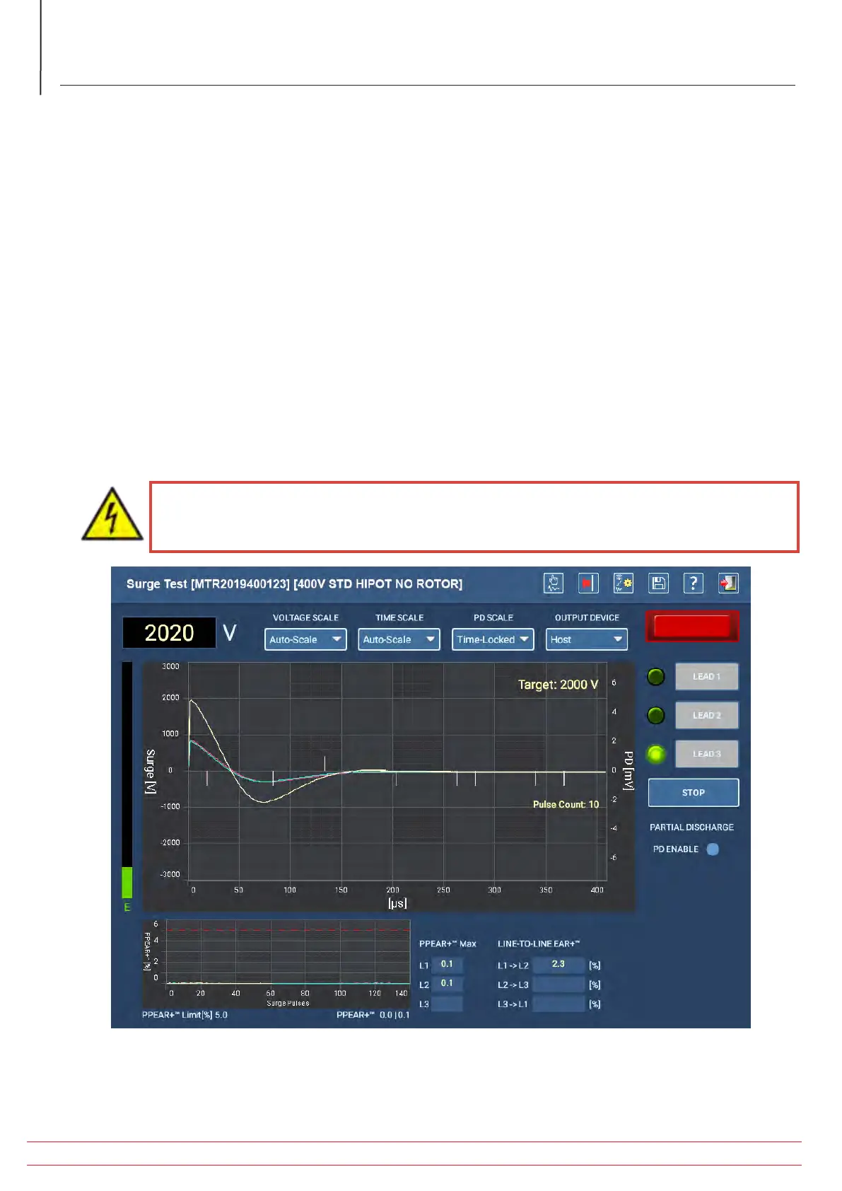 12. Surge test automatically begins next. The leads that will be tested are identified by the green indicators to the left