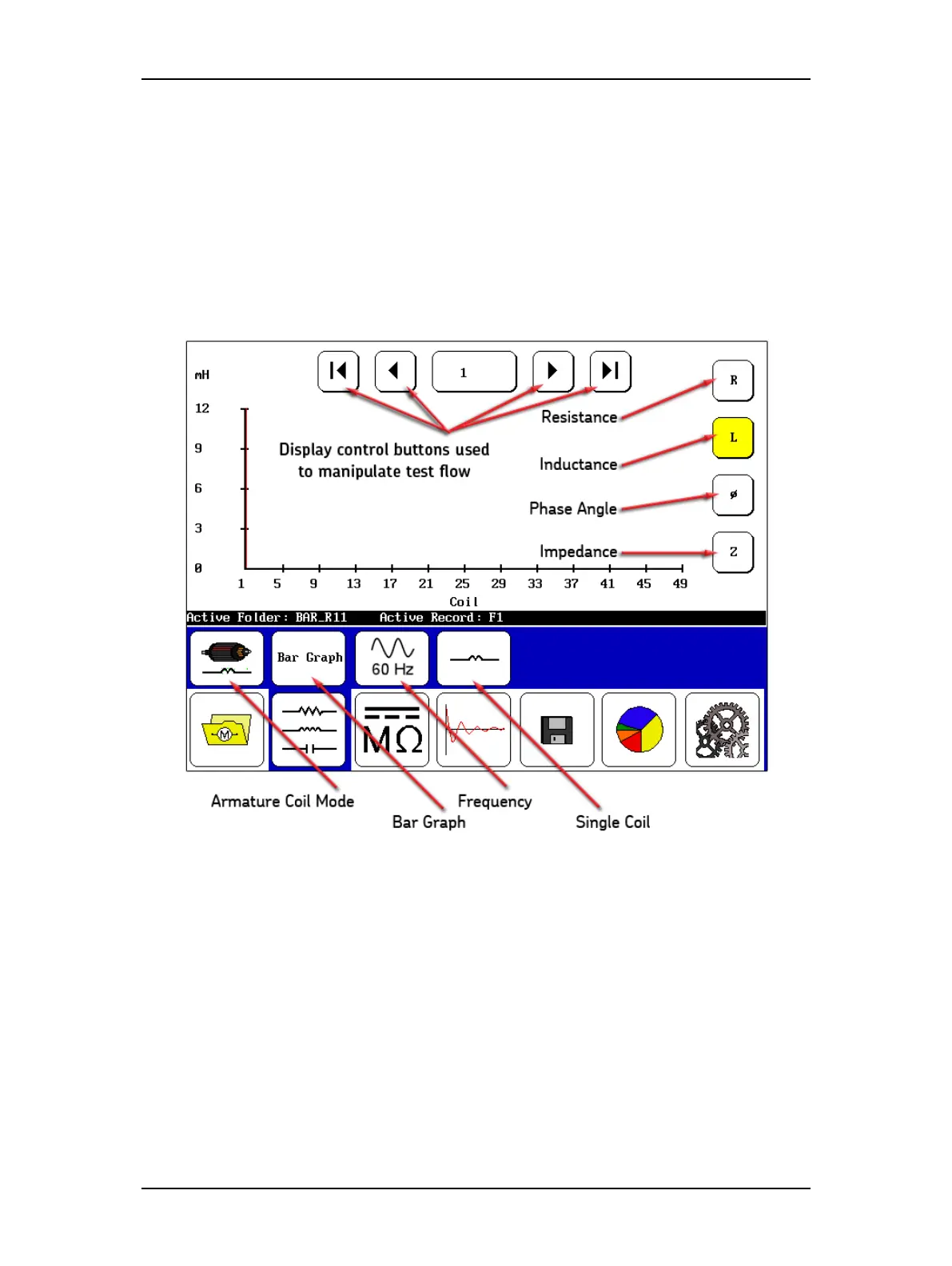 The display control buttons at the top move you through which coil or armature bar