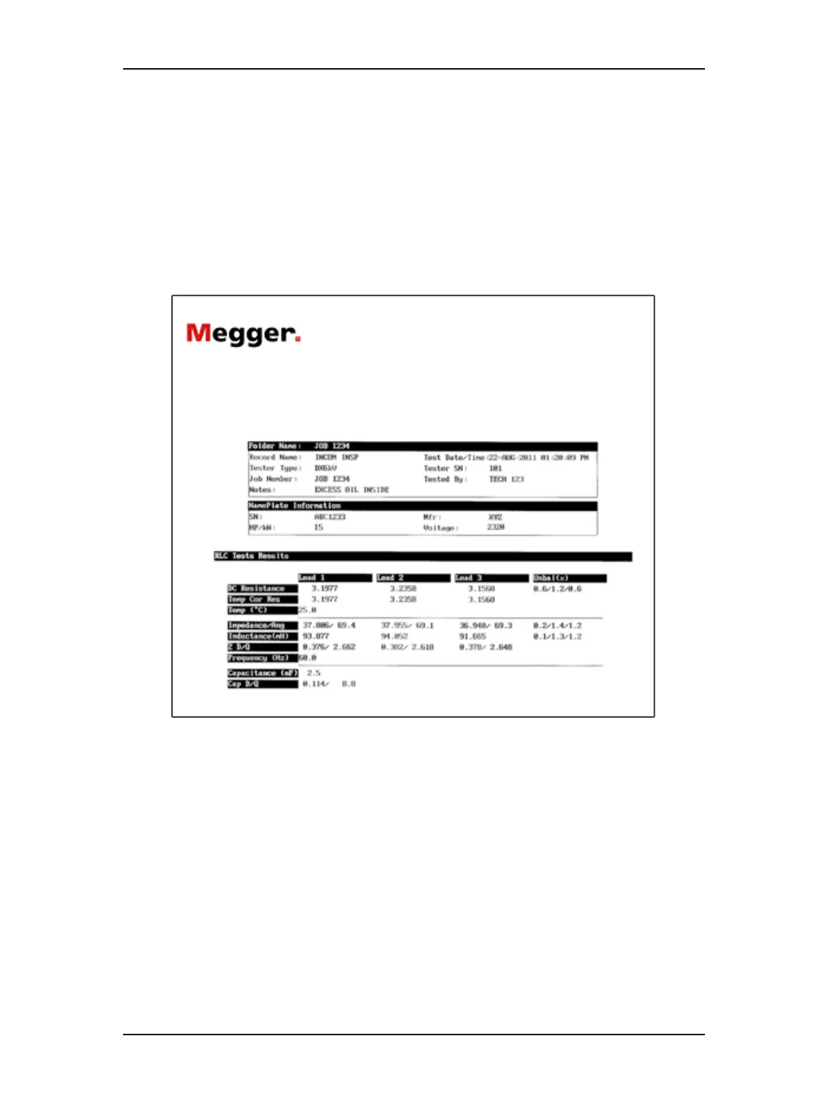 4. The report will print with a logo (if used; Megger in this example) just to the left of the