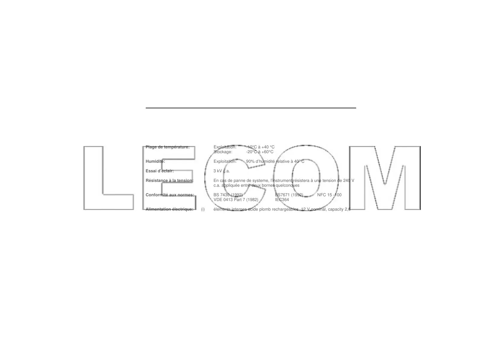 Alimentation électrique: (i) élements internes acide plomb rechargeables, 12 V nominal, capacity 2,6
