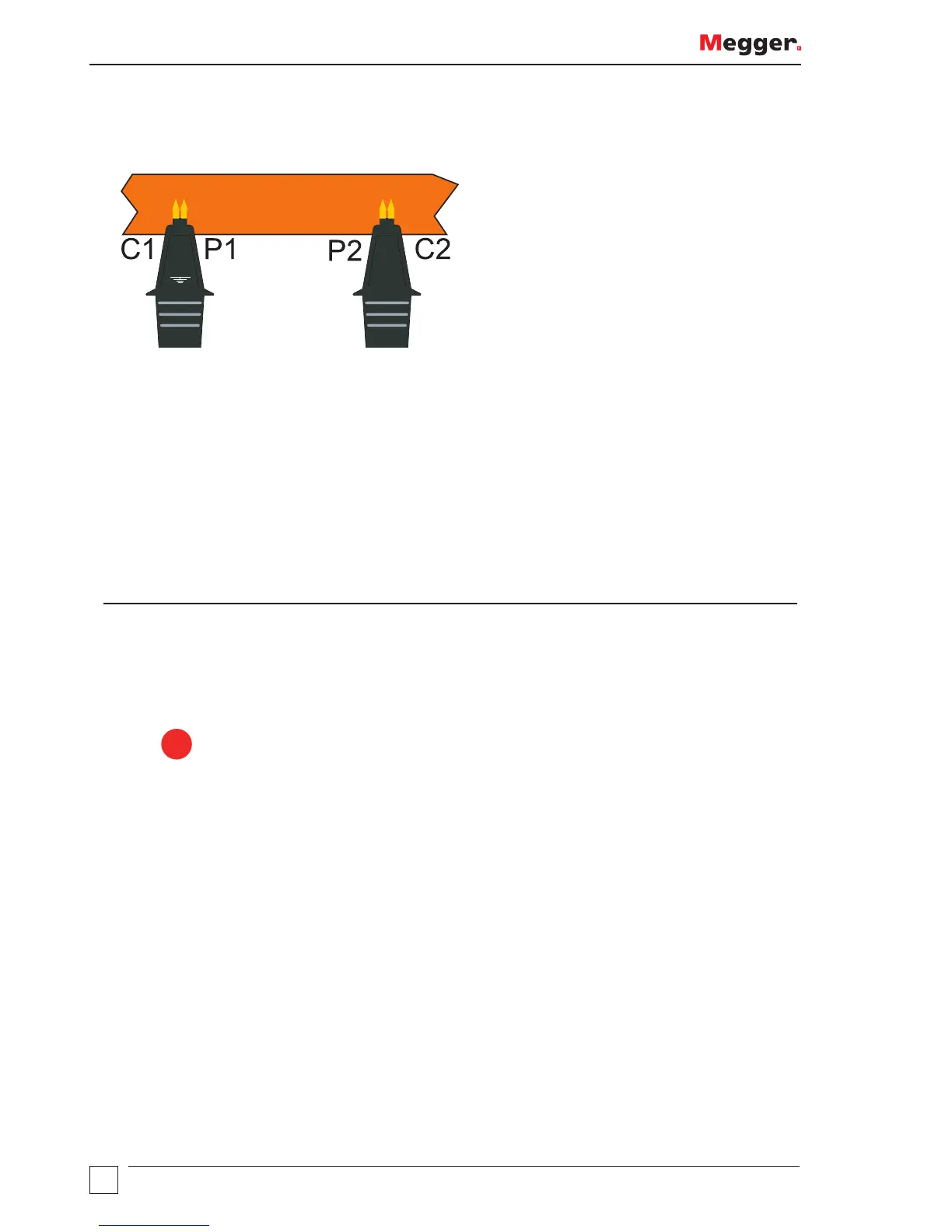 The image shows the correct test lead connection of the current (C1, C2) and potential probes (P1, P2) to a test