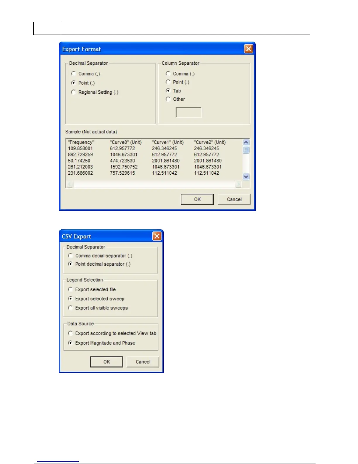 Exports the entire file, selected sweeps or all visible sweeps to a *.csv file. If you use selected