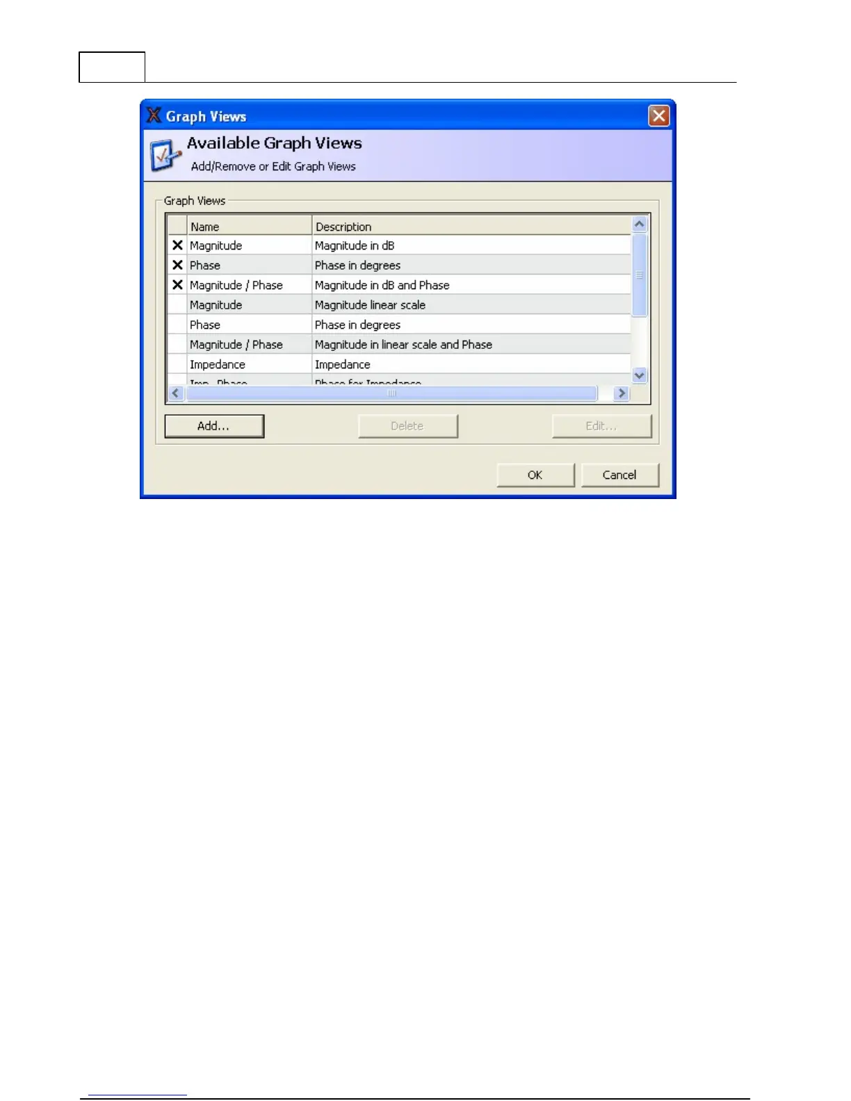 To edit or delete a custom graph, select the graph in the list and then click the Delete or