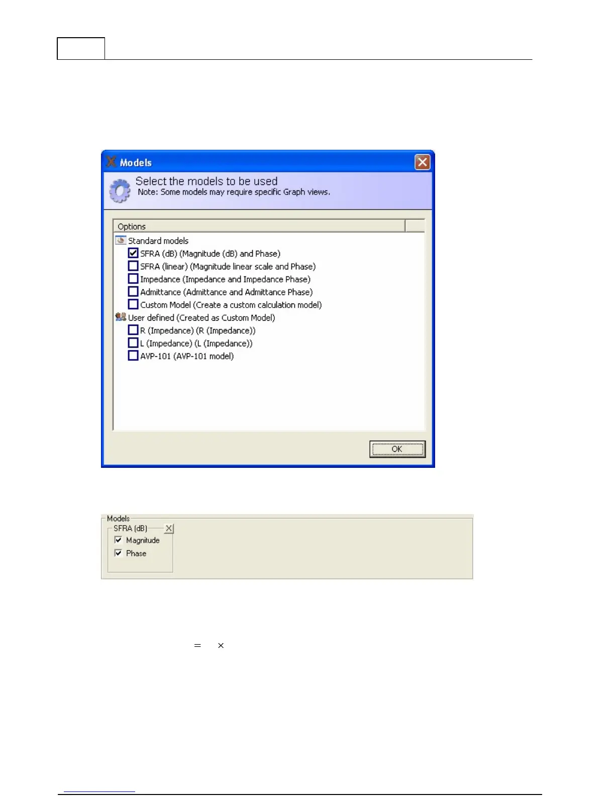 together with a probe model. In the dialog below, the SFRA (dB) model is selected. This is the