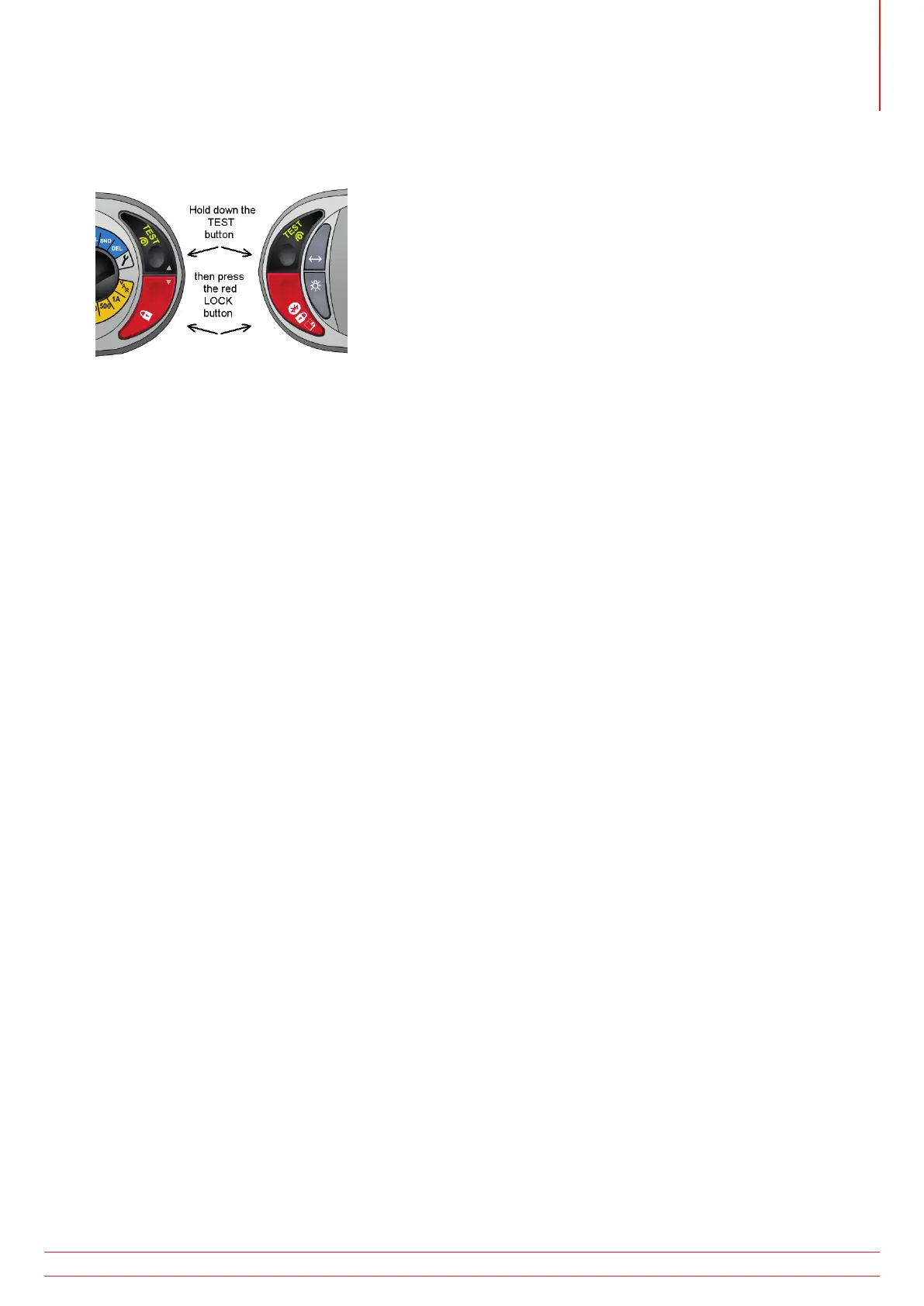 To lock an insulation test ON, hold down either of the TEST buttons followed by either of the RED LOCK buttons.