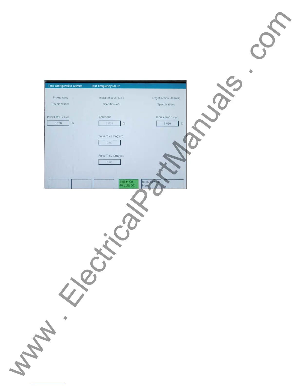 The test configuration menu is used to adjust the advanced relay testing parameters. The TVI