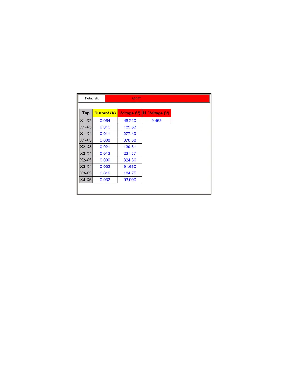 H Voltage (V): The MVCT the real time voltage readings of the primary H winding while the test