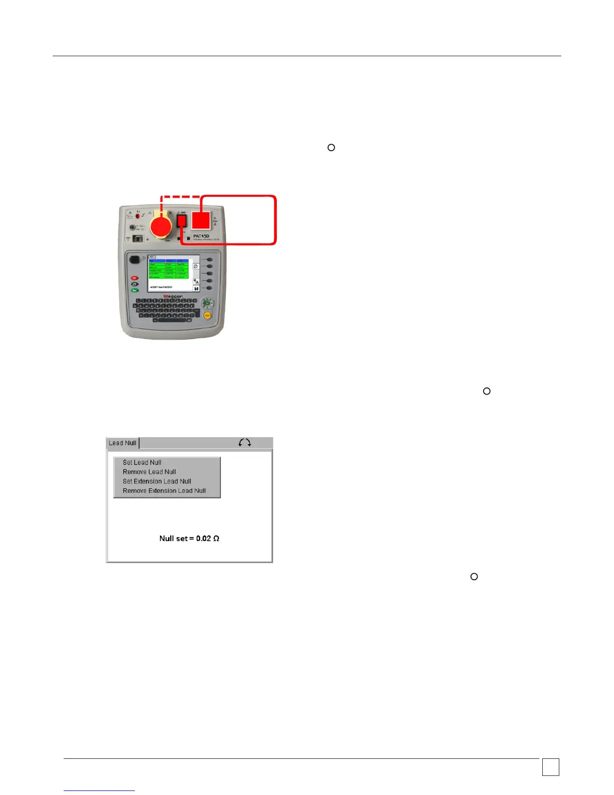 5) Press the TEST button. The PAT400 will display the value of the test lead as a Null SET value, and display the symbol in the