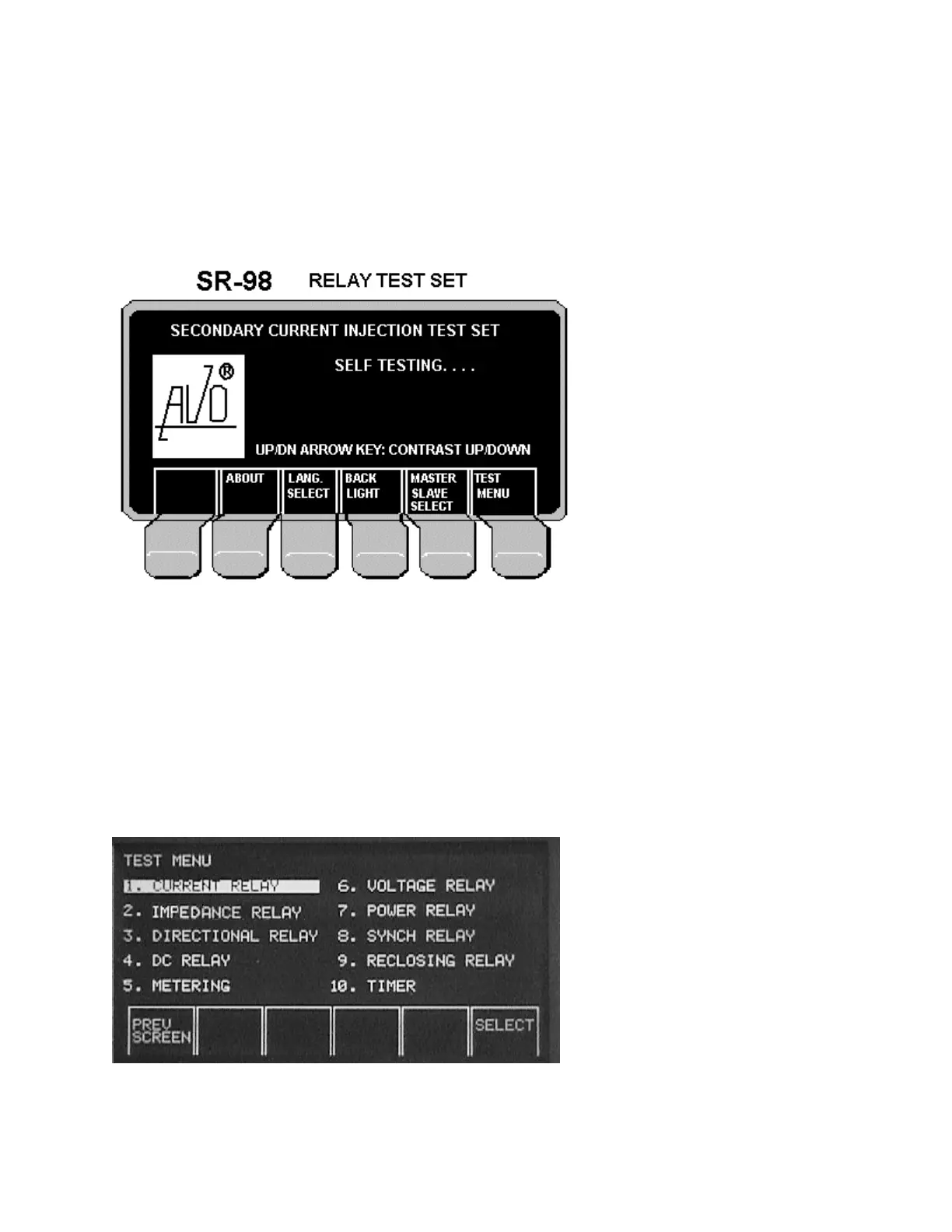 The Test Menu Screen allows the user to select which type of relay to test, metering or