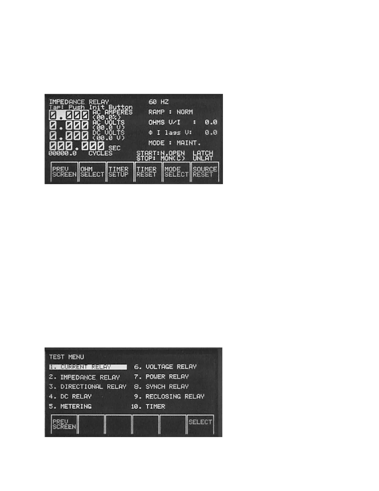 menu list. The user simply selects what type of relay is to be tested and a test screen is