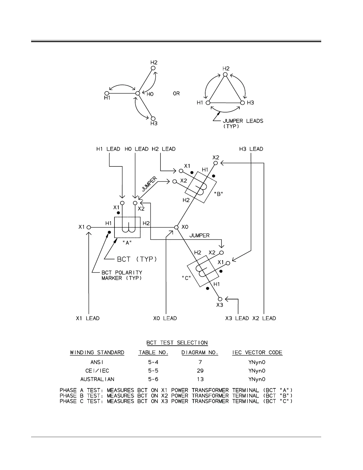 Megger TTR310 - Figure 5-9. Setup for Testing BCT Mounted on Wye Winding of a Three-Phase Transformer