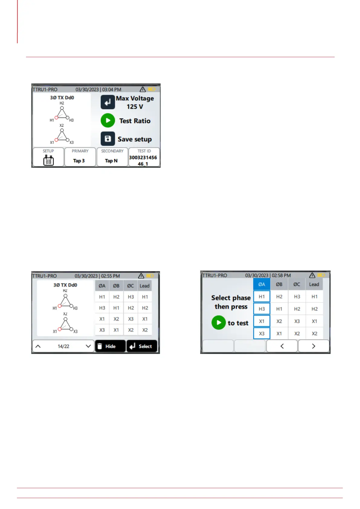 screen is used to select which phase is being tested. Use the left or right arrows to select the phase to test, then