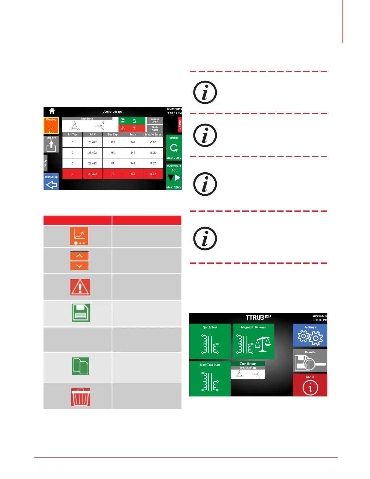 date & time, test voltage, test mode, number of taps