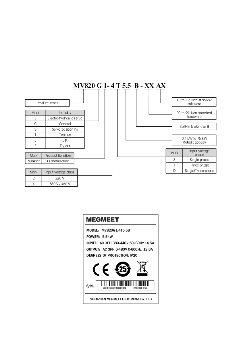 Megmeet MV820 - Chapter 1 Introduction of MV820 Series; Product Model; Product Nameplate