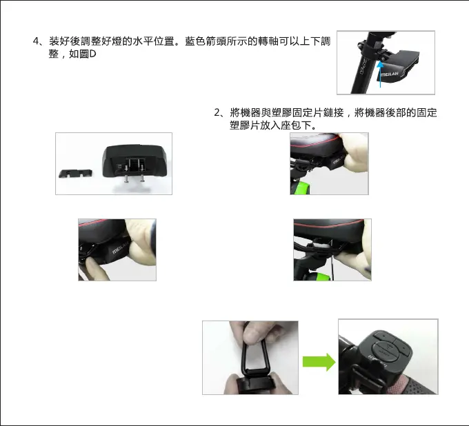 3、在下方放入另一片固定塑膠片。 4、并將兩個螺絲擰緊,可以上下方向調整位置。