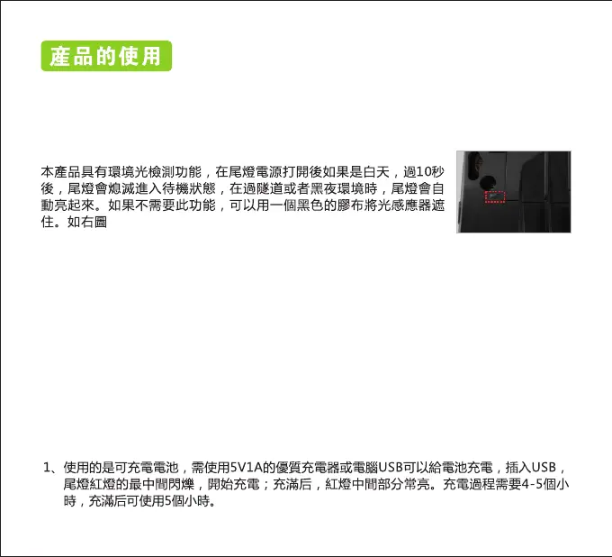 1、長按尾燈上的電源開關,尾燈打開/關閉。
