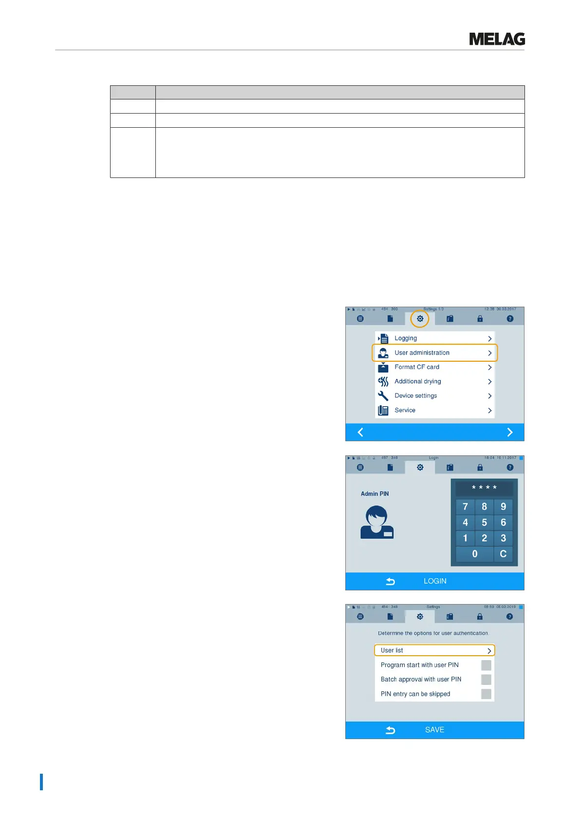tion via a PIN in the User administration menu. Activation of this option documents the user ID and