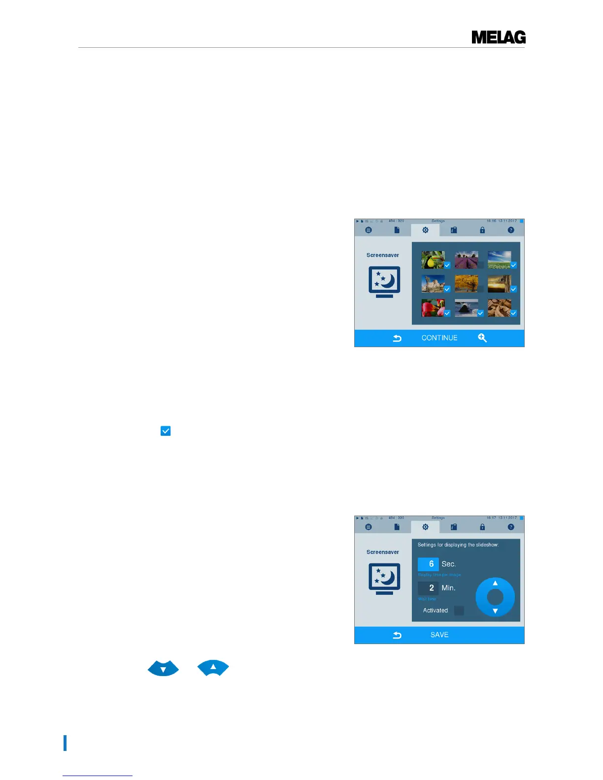 1. SelectSettings →Screensaver . The display