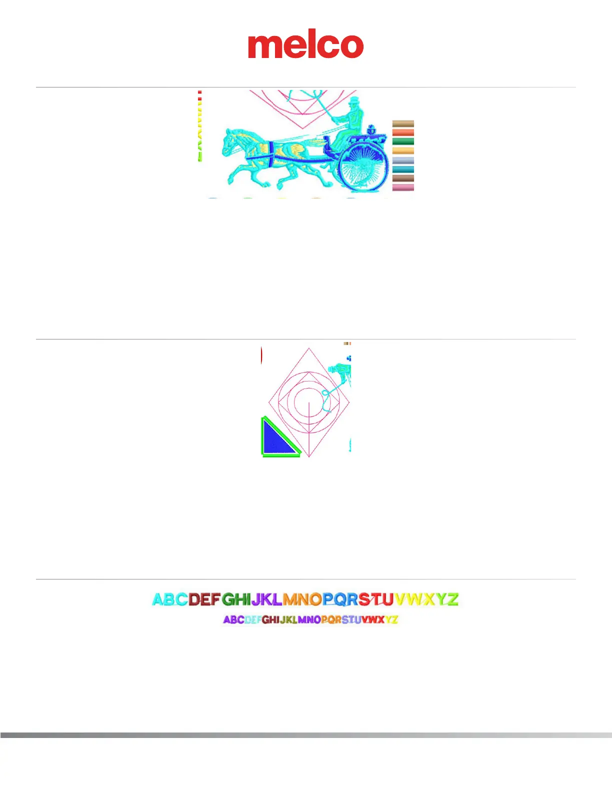 The small alphabet test design checks for the ability to do small lettering without thread breaks, pull-outs,