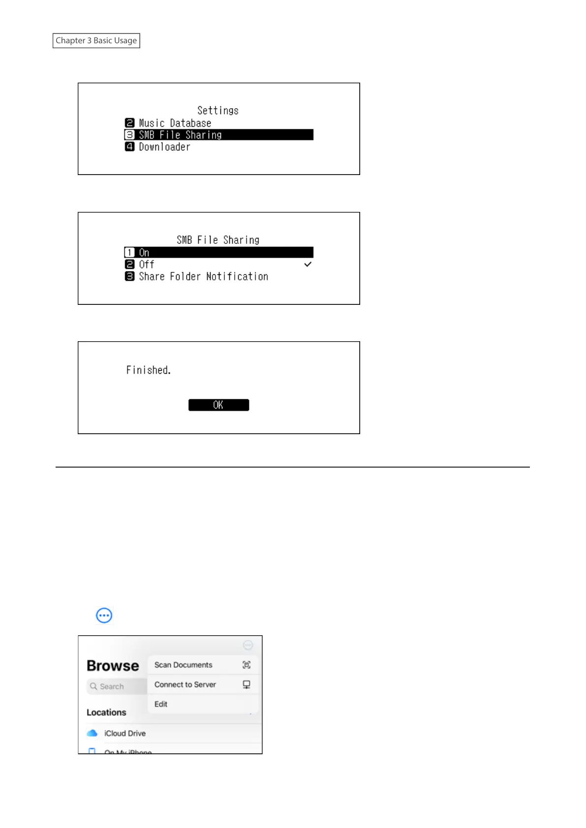 3 Press the Up/Down buttons and select “SMB File Sharing”, then press the Menu/Enter button.
