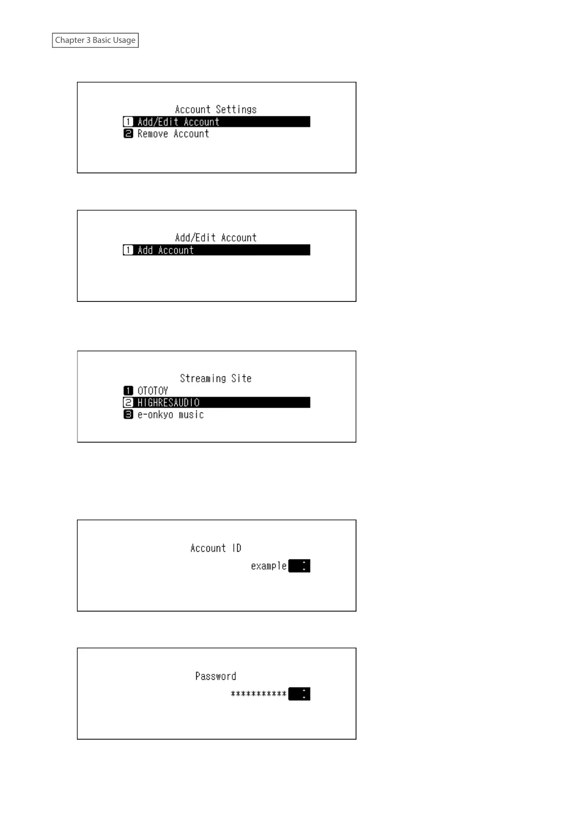 9 Press the Up/Down buttons and enter the account ID, then press the Menu/Enter button.