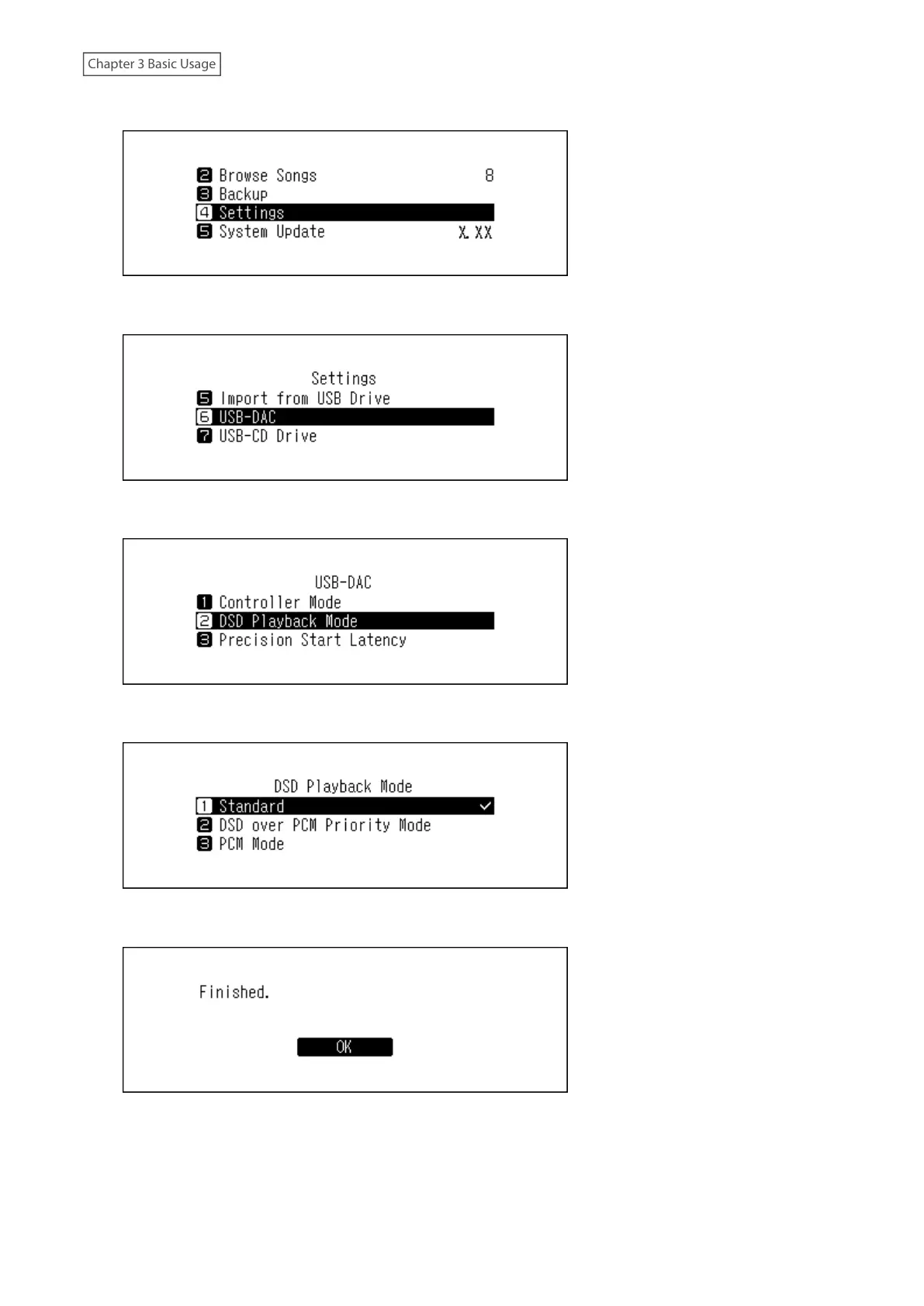 3 Press the Up/Down buttons and select “USB-DAC”, then press the Menu/Enter button.
