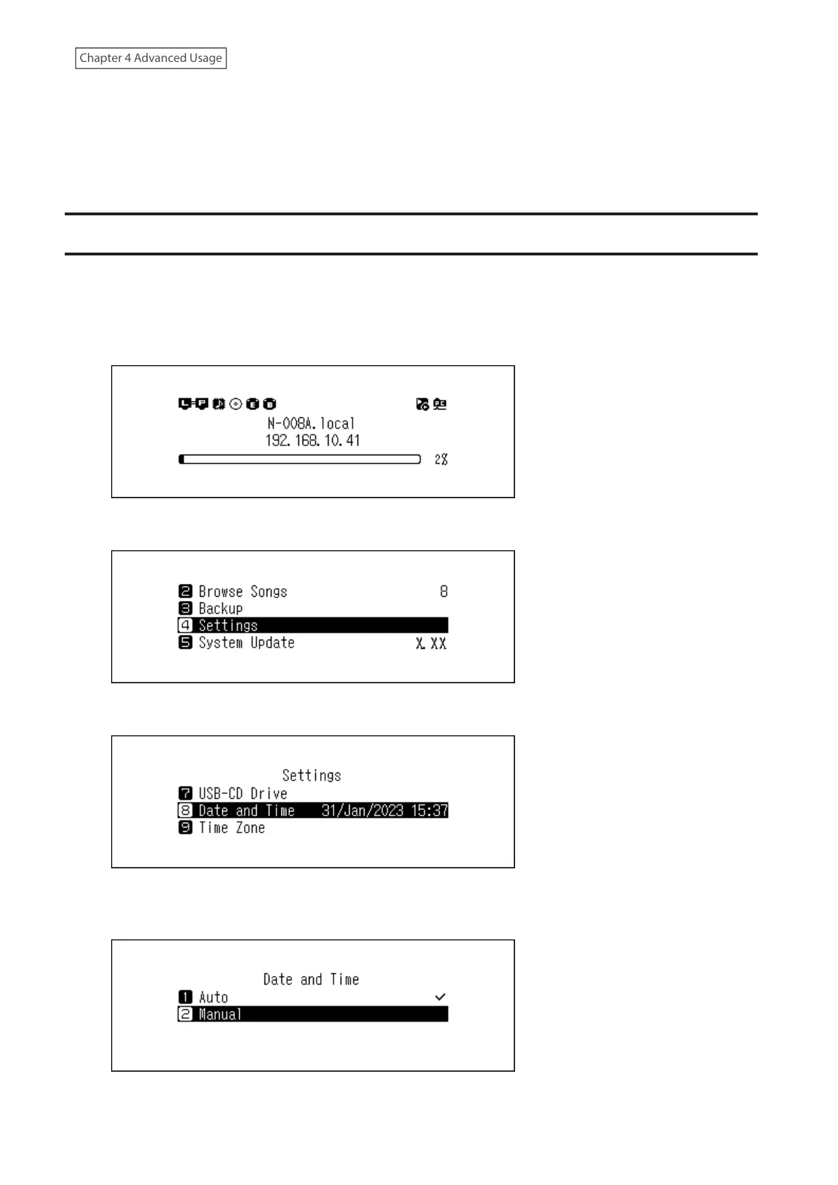 3 Press the Up/Down buttons and select “Date and Time”, then press the Menu/Enter button.